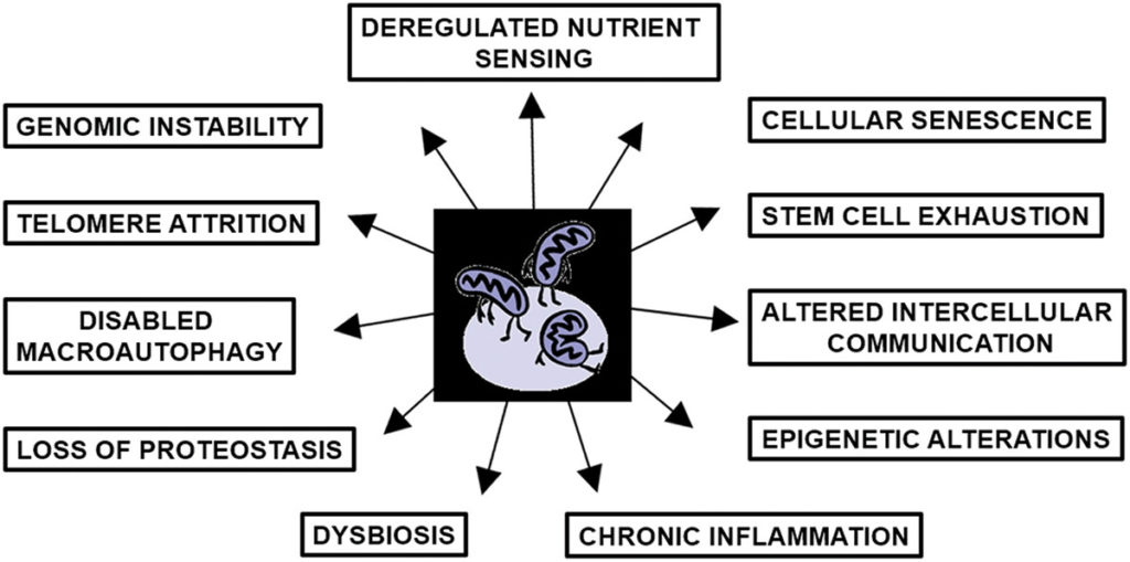 The relationship between mitochondrial dysfunction and the remaining hallmarks is less obvious. Although, through mechanisms like damaged mitochondrial DNA, there is evidence supporting the role of dysfunctional mitochondria in promoting deregulated nutrient sensing, dysbiosis, disabled macroautophagy, epigenetic alterations, and the loss of proteostasis.