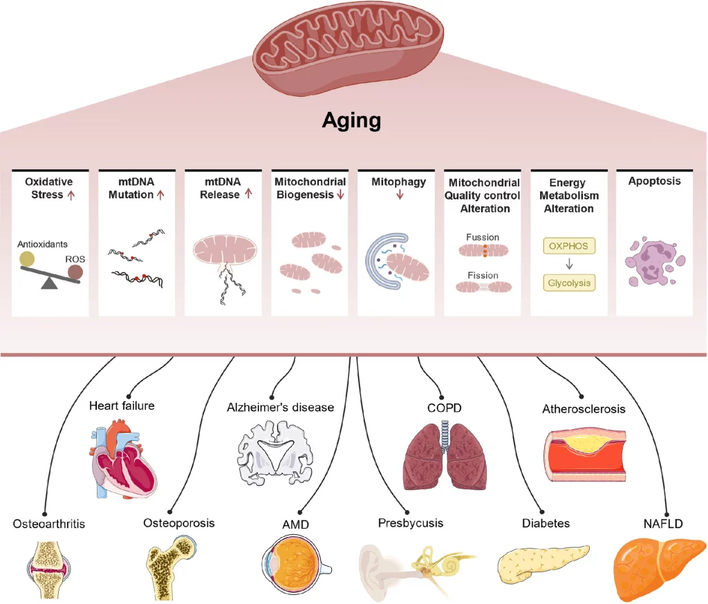 Through the process of generating ATP, mitochondria produce small amounts of highly reactive molecules known as reactive oxygen species (ROS). ROS are essential signaling molecules, and small quantities are not harmful. However, dysfunctional mitochondria produce excessive levels of ROS, causing oxidative stress, one of the hallmarks of aging.