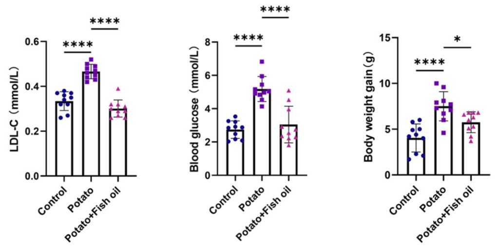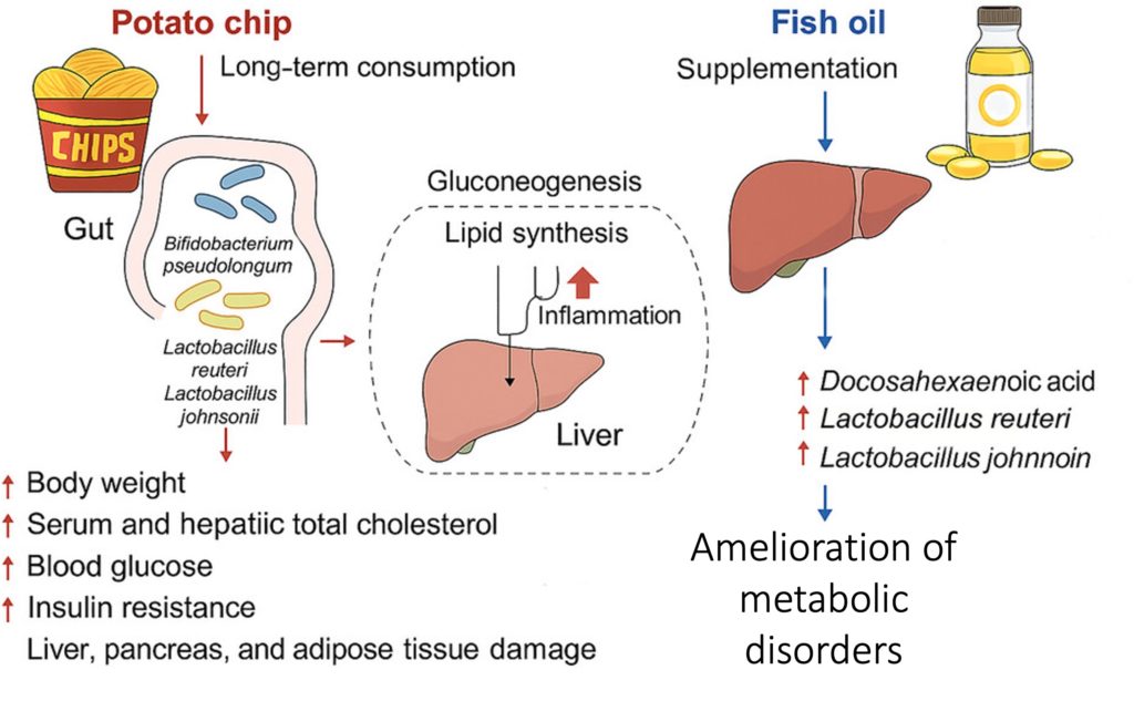 Strikingly, however, fish oil supplementation mitigated the loss of these probiotics while also raising the omega-3 fatty acid DHA (Docosahexaenoic acid). Together, these results suggest that fish oil counteracts the weight gain, metabolic dysregulation, organ damage, and gut microbiome imbalances induced by excessive potato chip consumption. These results also suggest that fried foods accelerate aging, which can be countered with fish oil.
