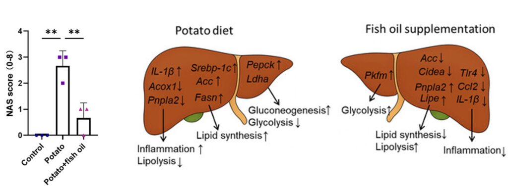 After 13 weeks of excessive potato chip consumption, the mice were examined for organ damage. Along with other measures, the NAS (non-alcoholic fatty liver disease activity score) was used to assess the liver, revealing that high potato chip consumption triggers moderate liver damage. However, fish oil supplementation not only reduced the NAS but also inflammatory immune cell infiltration and fat accumulation in the liver. Considering that such defects occur with aging, these findings suggest that fish oil counteracts liver aging induced by eating fried foods.