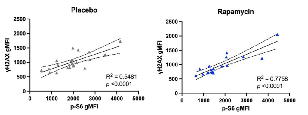 The results revealed a strong correlation between mTOR activation and DNA damage in the T cells of both groups, indicating that hyperactivation of mTOR contributes to DNA damage. However, in the rapamycin group, T cell DNA damage and mTOR hyperactivation were reduced, along with markers of cellular senescence, a major driver of aging. These preliminary results suggest that supplementing with a low dose of rapamycin can minimize T cell DNA damage and senescence by inhibiting the mTOR pathway.