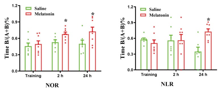 To assess memory, the melatonin- and saline-treated middle-aged mice were subjected to the NOR and NLR tests. Remarkably, for the NOR test, the melatonin-treated mice explored the novel object more than the saline-treated mice after a 2- and 24-hour delay, suggesting that melatonin prevents losing memories of objects. The melatonin-treated mice also explored the novelly located object with a higher propensity than saline-treated mice after a 24-hour delay, suggesting that melatonin prevents the forgetting of new locations.