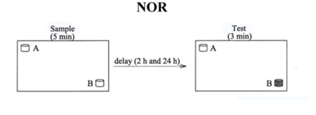 We may not be able to test whether mice remember complex experiences, but scientists have devised an eloquent method for determining if they remember objects, known as the novel object recognition (NOR) test. For the NOR test, each mouse is placed into a box containing two objects of differing size, color, or shape. After becoming familiar with the objects for five minutes, each mouse is removed from the box for either 2 or 24 hours.