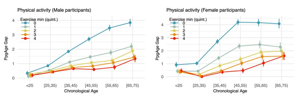 Physical activity showed a powerful protective effect. Participants in the lowest quintile of exercise (the least active 20%) appeared substantially older than their more active peers, with differences growing larger in older age groups. Among 65–75-year-old men, the least active appeared nearly 4 years older biologically, while the most active appeared only 1.3 years older than their chronological age.