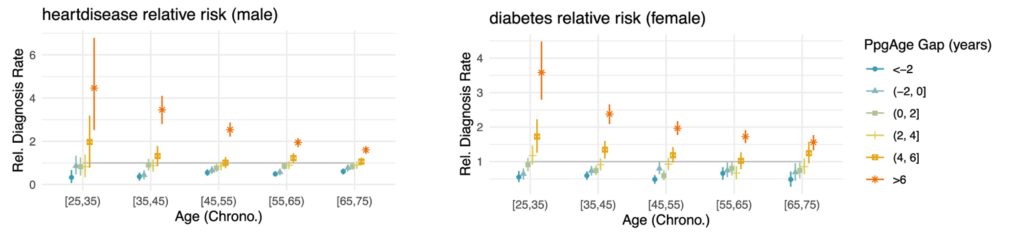 The Apple and Princeton University researchers found dramatic associations between elevated PpgAge gaps and disease. Among 35–45-year-old men, those whose biological age appeared more than 6 years older than their actual age had a heart disease diagnosis rate 3.5 times higher than average. For diabetes in women of the same age group, appearing 6+ years older was associated with a 2.4-fold increased diagnosis rate.