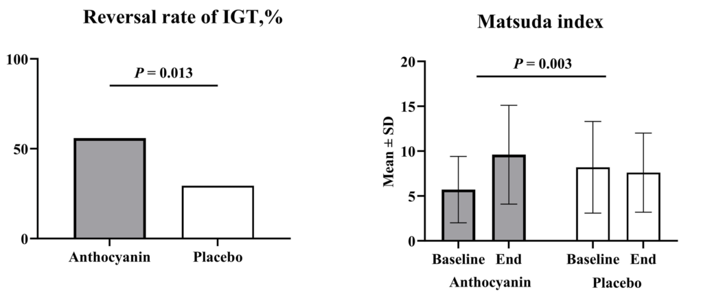The participants were randomly selected to receive either 160 mg of anthocyanins or a placebo for 12 weeks. After 12 weeks, about 56% of participants in the anthocyanin group exhibited a reversal of IGT, while only 30% of the placebo group did. Additionally, to obtain a better assessment of IR, the researchers turned to the Matsuda index, which incorporates blood glucose and insulin levels to determine IR. As gleaned from the reversal of IGT, the Matsuda index was significantly higher in the anthocyanin group, suggesting a reduction in IR.