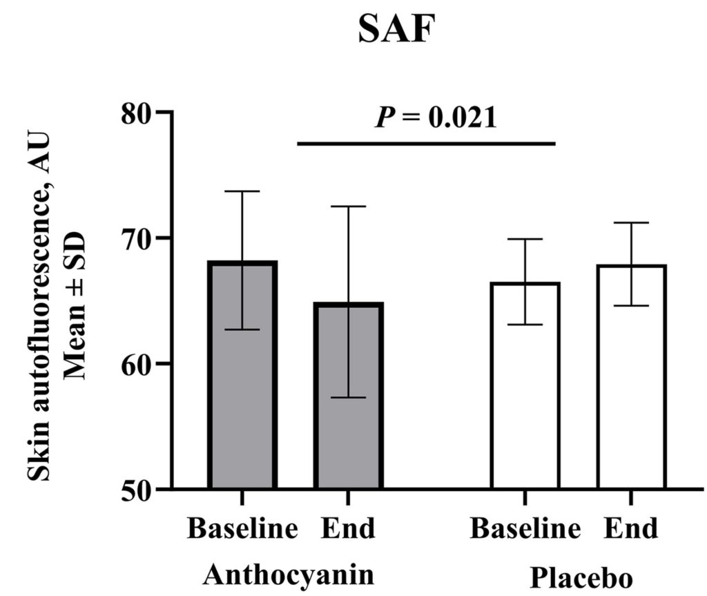 AGEs directly interact with insulin and its receptors, which disrupts insulin signaling and leads to insulin resistance. Moreover, AGEs can interact with collagen in the skin, promoting wrinkles and other aspects of skin aging. Interestingly, the type of AGEs found in the skin emit fluorescent light that can be easily measured. With this in mind, the Wuhan scientists examined and found that the anthocyanin group exhibited less skin AGEs than the placebo group. These findings point to the ability of anthocyanins to reduce AGEs in the skin and potentially the insulin signaling machinery.
