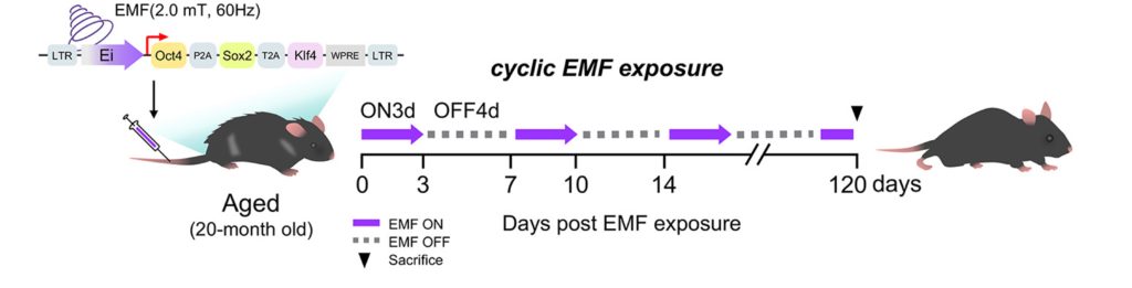 With this mechanism in hand, the team engineered a controllable gene system. They used gene therapy to inject the cellular reprogramming genes—Oct4, Sox2, and Klf4 (collectively called OSK)—into older mice. These genes were placed under the control of the Ei switch, meaning they could be turned on or off simply by applying EMFs. In effect, EMFs became a remote control for gene activity.