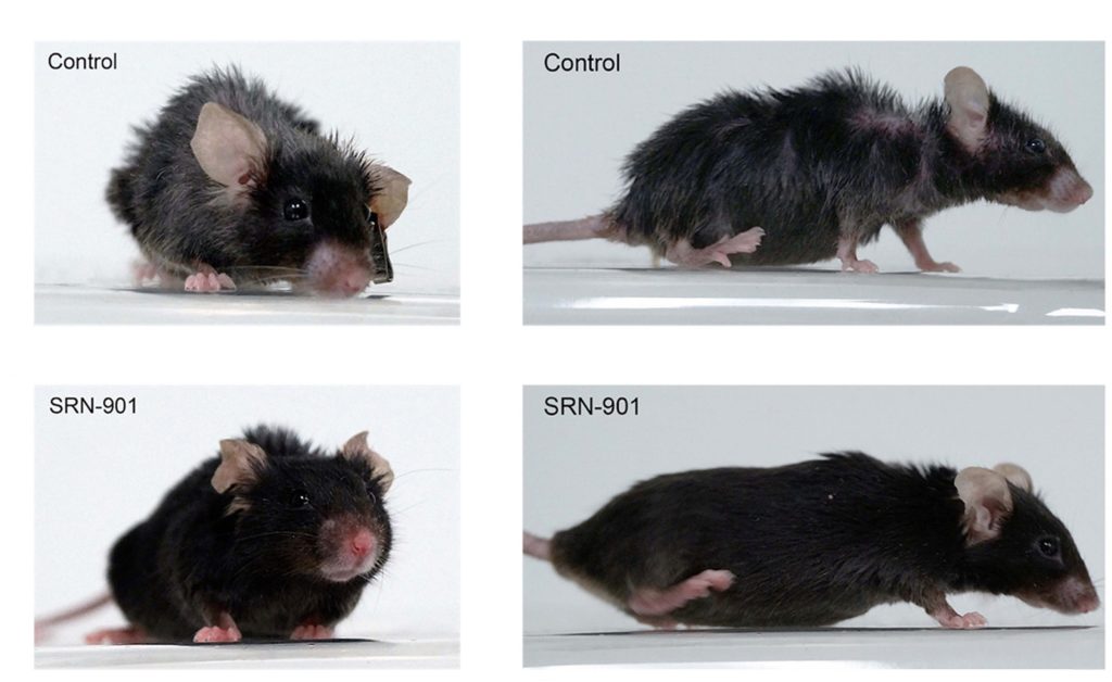 To evaluate the effects of SRN-901 on late-life survival, the researchers studied 18-month-old C57BL/6 mice, which the article describes as roughly comparable to 56-year-old humans. The animals received SRN-901, rapamycin, nicotinamide mononucleotide (NMN), or NR, and were followed until humane end-of-life criteria were reached.