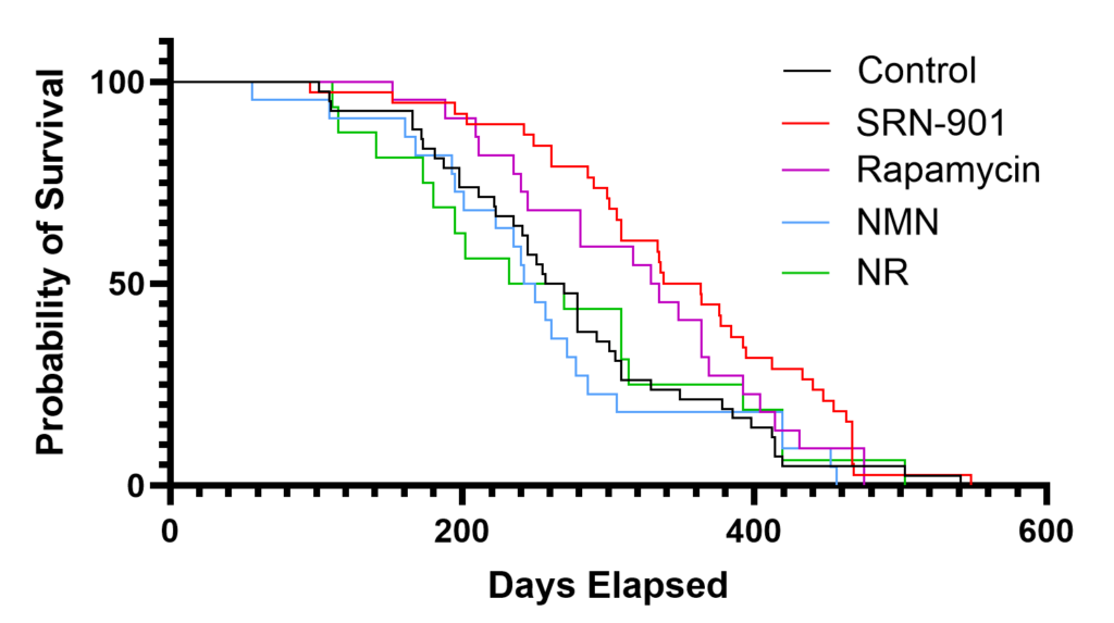 The SRN-901-treated mice showed a 33% increase in median remaining lifespan. Treatment was also associated with a 46% reduction in the hazard of death. Rapamycin significantly extended lifespan as well, but not to the same extent as SRN-901, while NMN and NR did not significantly improve lifespan in this experiment. Those results suggest that SRN-901 produced a comparatively strong survival signal in this late-life mouse model.